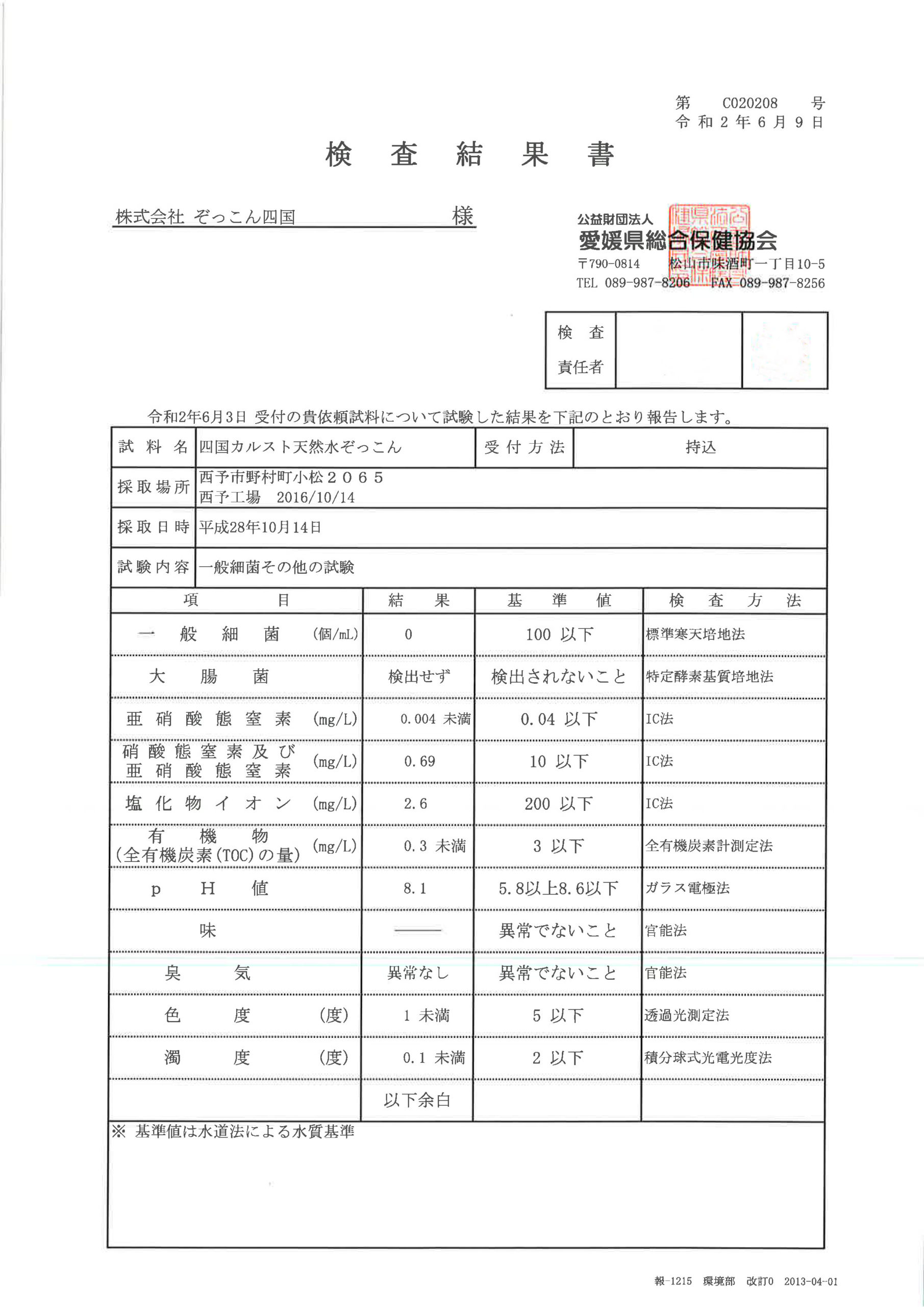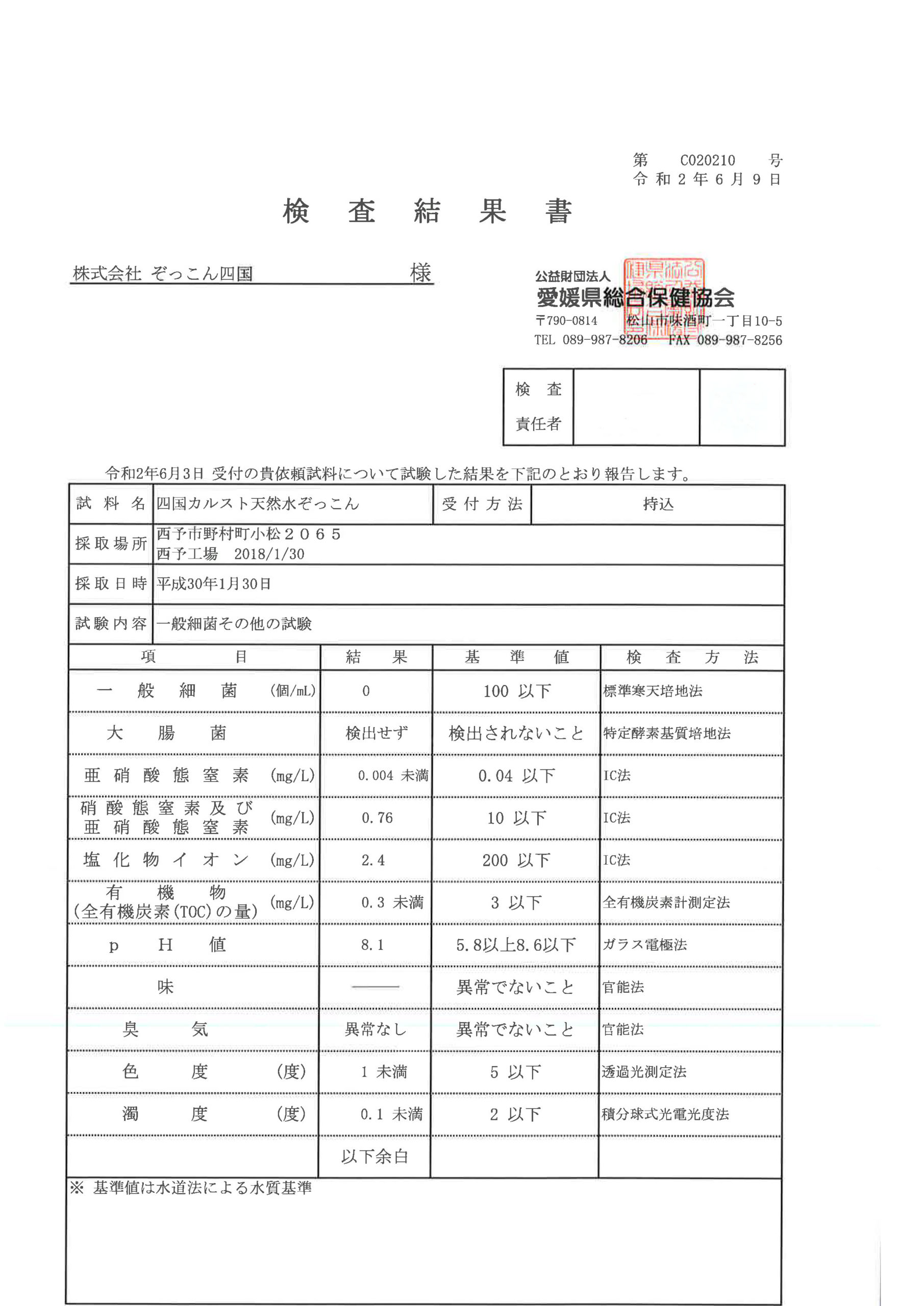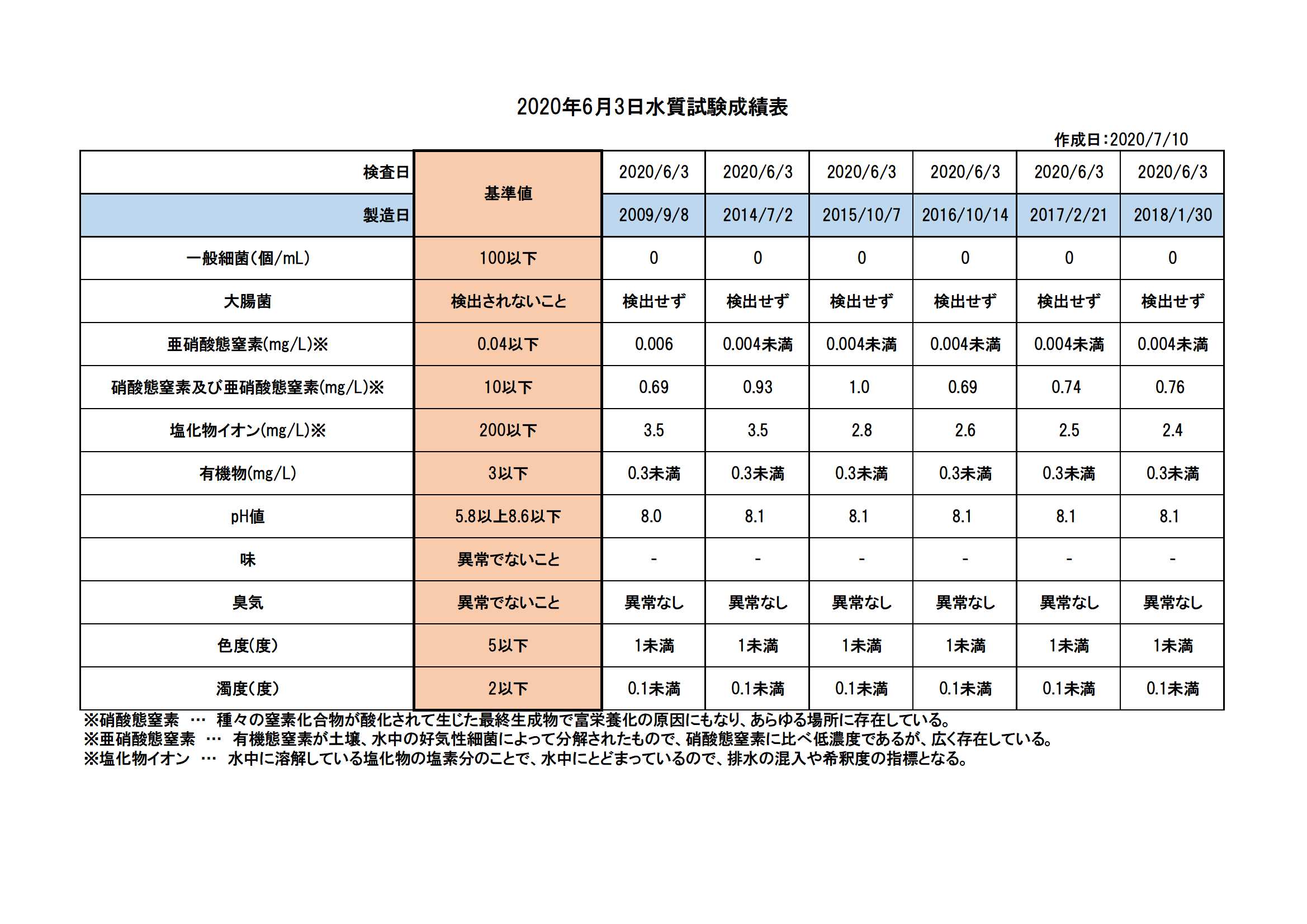 2020年6月3日(水)に水質検査に提出しました。