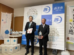 西予市に対して寄付金と備蓄用の天然水を寄附いたしました。